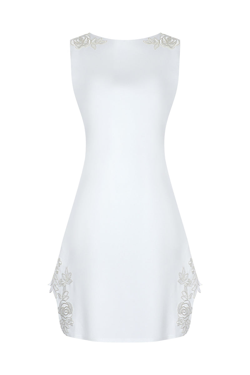Crafted from soft, organic cotton crepe, this timeless piece features delicate white rose embroidery that adds a touch of sophistication. The flowing silhouette and comfortable fit make it perfect for any occasion.