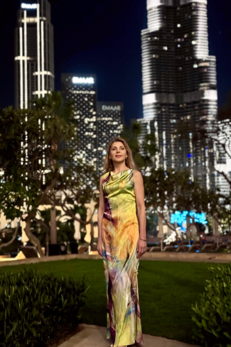 Vibrant multicolor print inspired by Dubai's futuristic city lights