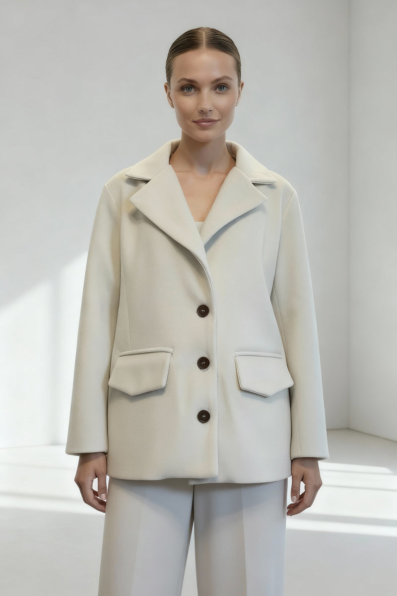 Designed with wide lapels, deep front pockets, and tortoiseshell button detailing, it evokes understated sophistication — the kind that speaks softly yet leaves a lasting impression. Whether layered over tonal separates or styled with bold contrast, the Muse Blanc Jacket elevates every ensemble with quiet power.