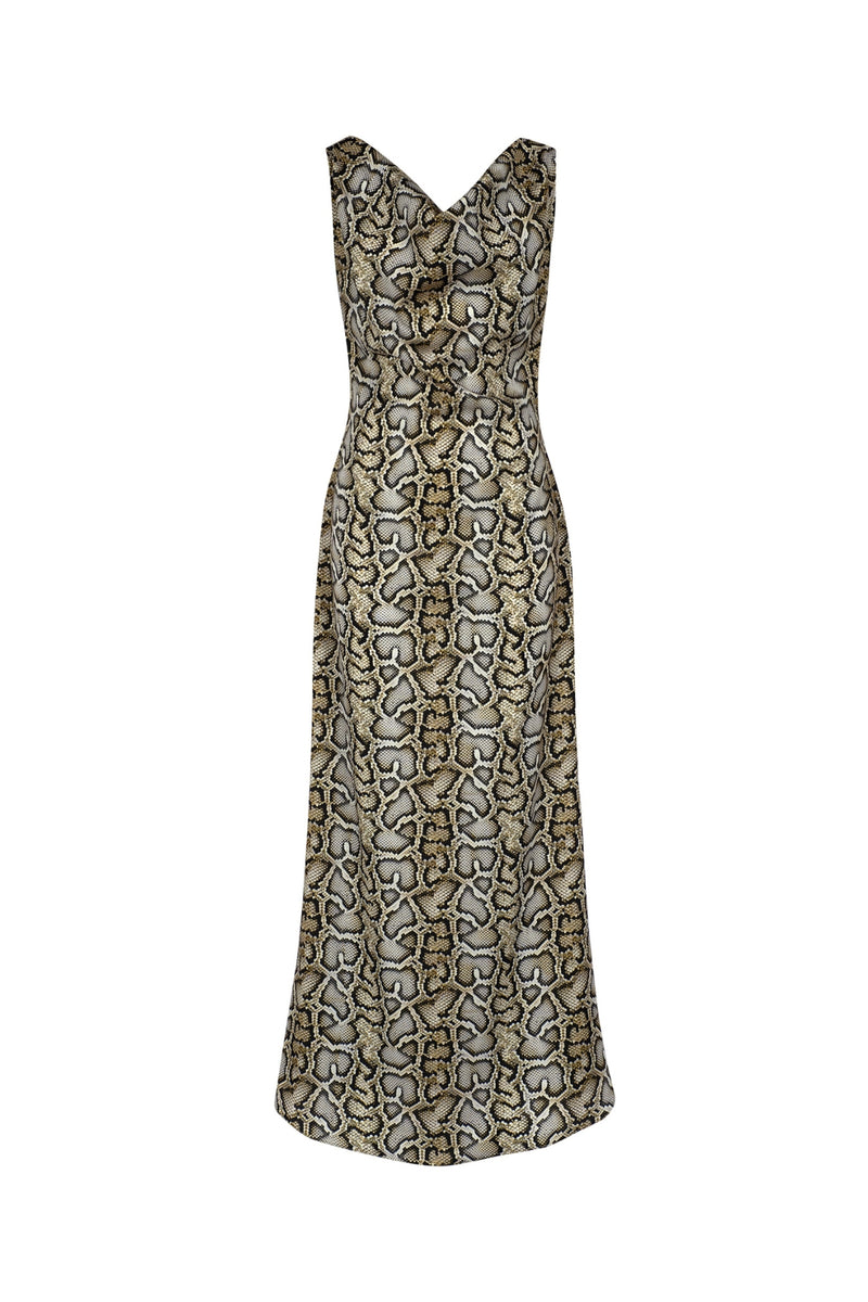 Unleash your bold side in the Wild Muse Python Dress, crafted from glossy satin that skims the body with elegance. Featuring a striking python print and draped cowl neckline, this sleeveless silhouette is made for nights when you own the room.